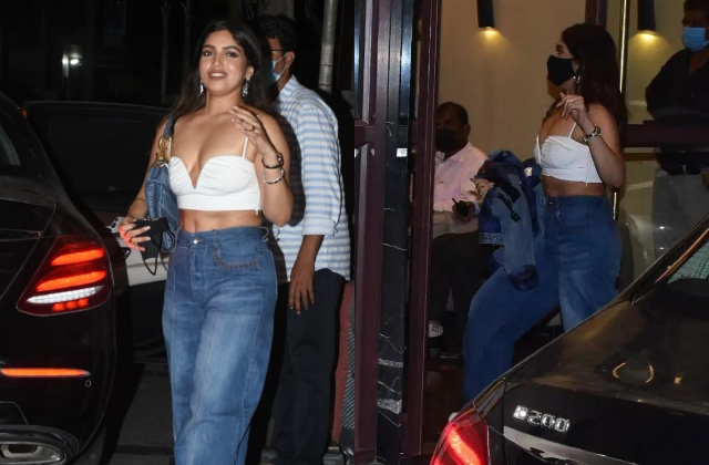 पार्टी में भूमि एक दम बोल्ड अंदाज में पहुंची। भूमि पेडनेकर व्हाइट नूडल-स्ट्रैप्ड क्रॉप टॉप और हाई-वेस्ट डेनिम पैंट में कहर ढा रही थीं। उन्होंने अपने साथ मैचिंग डेनिम जैकेट भी कैरी की थी। टाॅप में उनके क्लीवेज साफ दिख रहे थे।