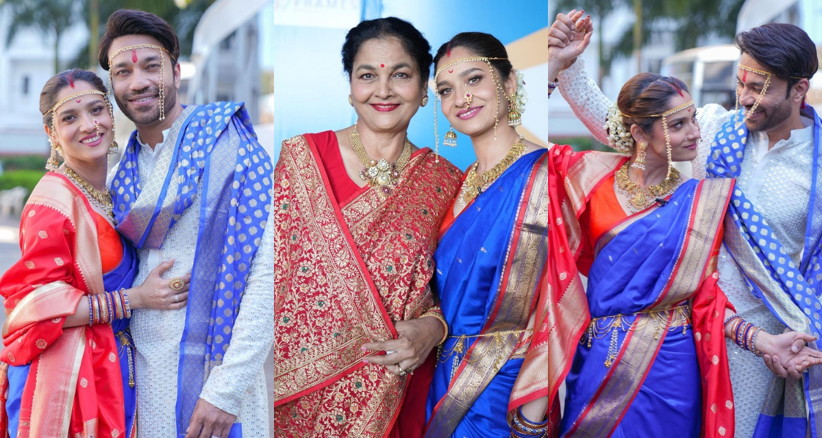 ब्लू साड़ी..मांग में सिंदूर..महाराष्ट्रीयन ज्वेलरी और नथ...मराठी मुल्गी बन इतराईं अंकिता लोखंडे ने पिया विक्की और मां संग खूब दिए पोज