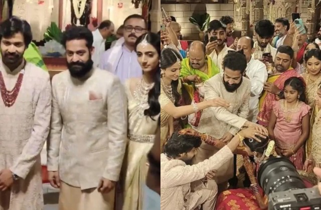 वायरल हुए वीडियोज में जूनियर एनटीआर को रस्मों में हिस्सा लेते, नवविवाहित जोड़े पर फूल बरसाते और उन्हें आशीर्वाद देते हुए देखा जा सकता है।