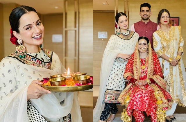 तस्वीरों में कंगना ने अपने हाथों दीयों वाली थाली ली हुई है और वे मुस्कुरा रही हैं। वहीं फैमिली तस्वीर में घर की नई बहू लाल जोड़े में बैठी हैं और अक्षत-रंगोली भी साथ में खड़े हैं। इन तस्वीरों के साथ कंगना ने बेहद ही प्यारा कैप्शन भी दिया।