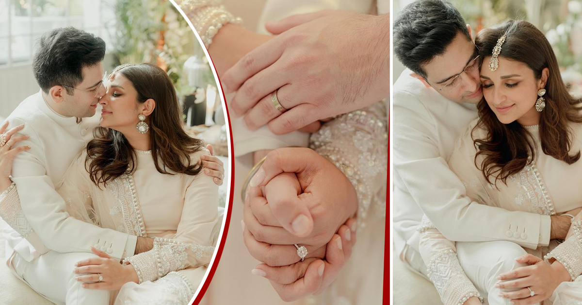 इन तस्वीरों में परिणीति-राघव एक दूसरे की बाहों में रोमांटिक पोज दे रहे हैं। दोनों एक दूजे संग ट्विनिंग किए नजर आ रहे हैं। एक तस्वीर में दोनों अपने हाथों में इंगेजमेंट रिंग फ्लॉन्ट करते नजर आ रहे हैं। परिणीति के हाथ में खूबसूरत डायमंड रिंग नजर आ रही है, जबकि राघव के हाथ में चमचमाती गोल्ड रिंग दिख रही है।