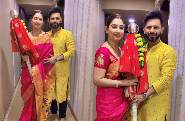 बी-टाउन के कई ऐसे कपल हैं जो शादी के बाद पहला गुड़ी पाडवा सेलिब्रेट कर रहे हैं। इस लिस्ट में बाॅलीवुड सिंगर राहुल वैद्य और टीवी एक्ट्रेस दिशा परमार का नाम भी शामिल है। कपल ने शानदार अंदाज में अपनी पहला गुड़ी पाडवा मनाया जिसकी तस्वीरें उन्होंने इंस्टा पर शेयर की हैं। शेयर की तस्वीरों में कपल का ट्रेडिशनल लुक देखने को मिल रहा है। लुक की बात करें तो दिशा पिंक साड़ी में बला की खूबसूरत लग रही हैं।