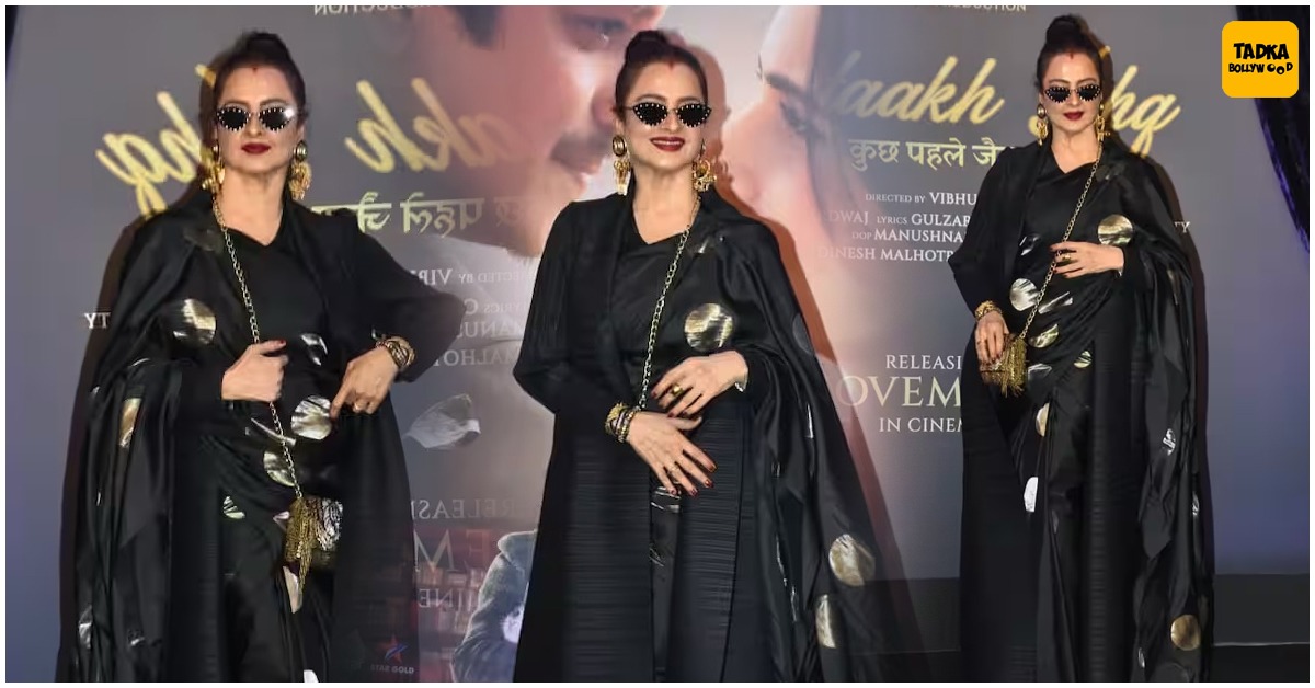 मांग में सिंदूर, आंखों पर काला चश्मा और हाई बन..‘गुस्ताख इश्क’ की स्क्रीनिंग छाईं रेखा, ब्लैक साड़ी में दिखा रॉयल अंदाज