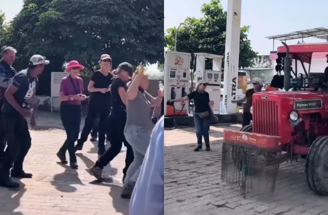 वायरल वीडियो में देखा जा सकता है कि एक ट्रैक्टर पेट्रोल पंप पर आता है और उसके लगे स्पीकर में अचानक 90 के दशक का सुपरहिट गाना ‘चुनरी चुनरी’ बजता है। जैसे ही तेज आवाज में गाने की बीट गूंजती है, वहां मौजूद विदेशी लोग खुद को रोक नहीं पाते और तुरंत ही डांस करना शुरू कर देते हैं!