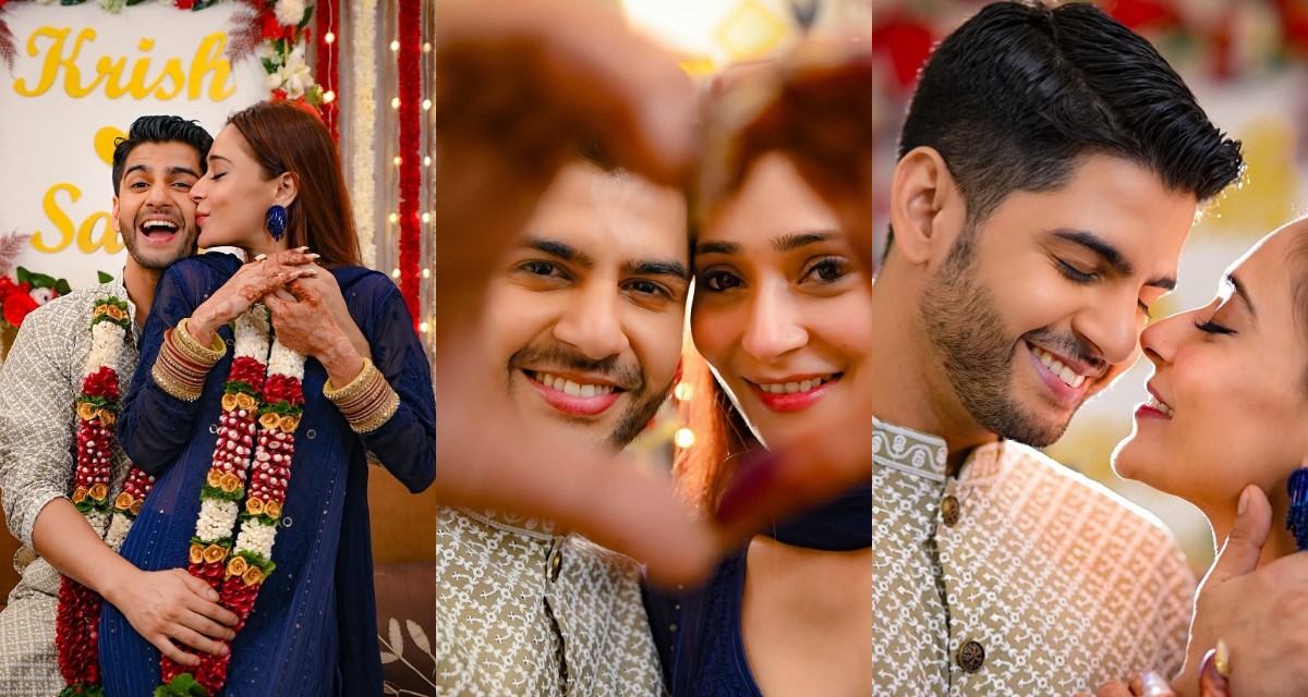 इस पर 6 अक्टूबर 2025 की तारीख डली हुई है। दूसरी तस्वीर में सारा और कृष आंखें बंद करके रोमांटिक पोज देते हुए नजर आ रहे हैं। तीसरी फोटो में दूल्हा और दुल्हन वरमाला पहने हुए दिखाई दे रहे हैं। लुक की बात करें तो सारा ने सिंपल से नीले सूट में शादी की है। उनके हाथ में खूबसूरत लाल और गोल्डन चूड़ियां भी नजर आ रही हैं। वहीं दूल्हे राजा भी शेरवानी में नजर आ रहे हैं।