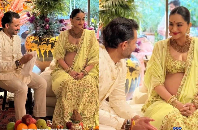 गोदभराई के खास दिन पर सोनम कपूर ने फ्लोरल प्रिंट वाली लाइम येलो रंग की साड़ी पहनी, जिसमें वह बेहद खूबसूरत नजर आ रही थीं। साड़ी के साथ उन्होंने हैवी गोल्ड ज्वेलरी कैरी की, जो उनके लुक को और निखार रही थी। चेहरे पर प्रेग्नेंसी ग्लो साफ झलक रहा था और उनकी मुस्कान ने पूरे माहौल को और भी खास बना दिया।