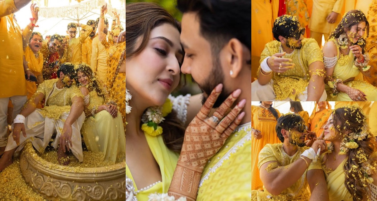 इसके बाद उनकी हल्दी सेरेमनी हुई जिसकी खूबसूरत तस्वीरें सामने आई हैं। हल्दी सेरेमनी के लिए एक्ट्रेस ने खूबसूरत येलो ड्रेस को चुना। लुक की बात करें तो वह येलो कलर की धोती स्टाइल साड़ी पहनी थी जिसमें वह बहुत ही खूबसूरत लग रही थीं।