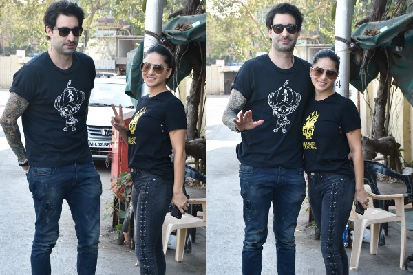 चेहरे पर ब्लैक गॉग्लस और हाई पोनी से अपने लुक को कम्पलीट किया हुआ है। वहीं डेनियल वेबर भी सनी के साथ मैचिंग किए हुए नजर आ रहे हैं।