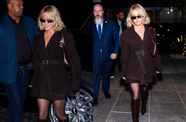 इस बेल्टेड डिजाइन ने उनके आवरग्लास फिगर को खूबसूरती से उभारा। इसके साथ उन्होंने मैचिंग मिनी स्कर्ट पहनी और अपने लुक को पूरा करने के लिए नी-हाई ब्राउन एलीगेटर प्रिंट बूट्स कैरी किए।