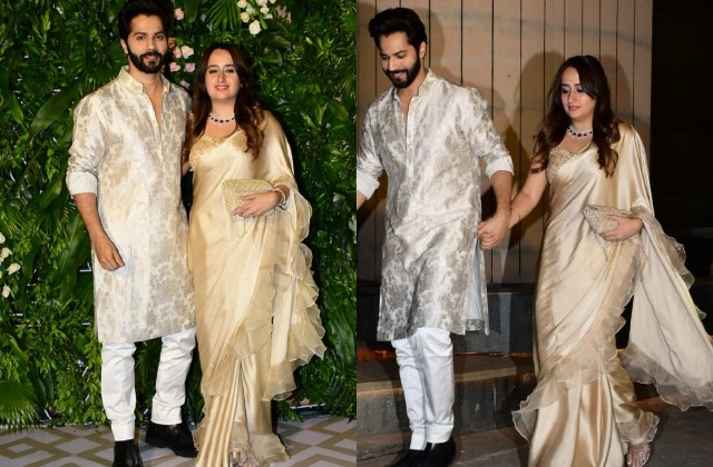 पत्नी का हाथ थाम वरुण ने कृति सेनन के दीवाली बैश में मारी शानदार एंट्री, गोल्डन साड़ी में 'मिसेज धवन' ने चुराई लाइमलाइट