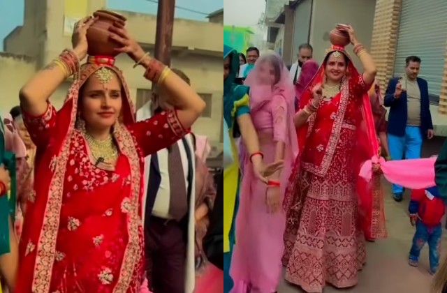 वीडियो में देखा जा सकता है कि सीमा एक हाथ से कलश संभाले आगे बढ़ती हैं, जबकि दूसरे हाथ से हल्के-फुल्के डांस स्टेप्स करती नजर आती हैं। वहीं सचिन मीणा भी पूरे पारंपरिक अंदाज में उनके साथ चलते दिख रहे हैं। दोनों के आसपास परिवार और करीबी लोग ढोल की थााप पर जश्न मनाते दिखाई दे रहे हैं।