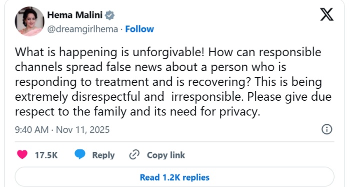 जब धर्मेंद्र अस्पताल में भर्ती थे तो उनके निधन की अफवाहें तेजी से वायरल हुई थीं, जिसके बाद हेमा मालिनी ने उनके निधन की झूठी खबरें फैलाने वालों को आड़े हाथ लिया। एक्ट्रेस ने अपने एक्स हैंडल पर लिखा था, "जो हो रहा है वो माफ करने लायक नहीं है! जिम्मेदार चैनल ऐसे व्यक्ति के बारे में झूठी खबर कैसे फैला सकते हैं? यह बेहद अपमानजनक और गैरजिम्मेदाराना है।"